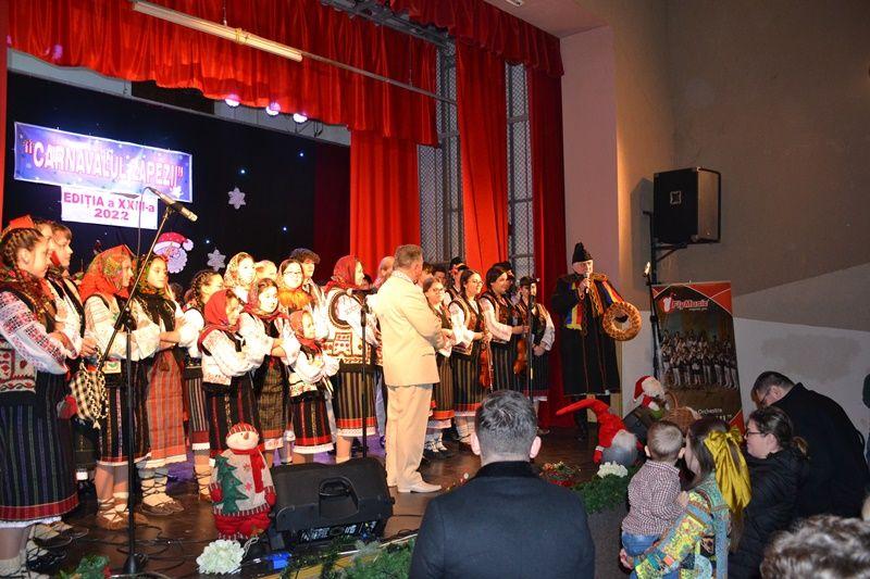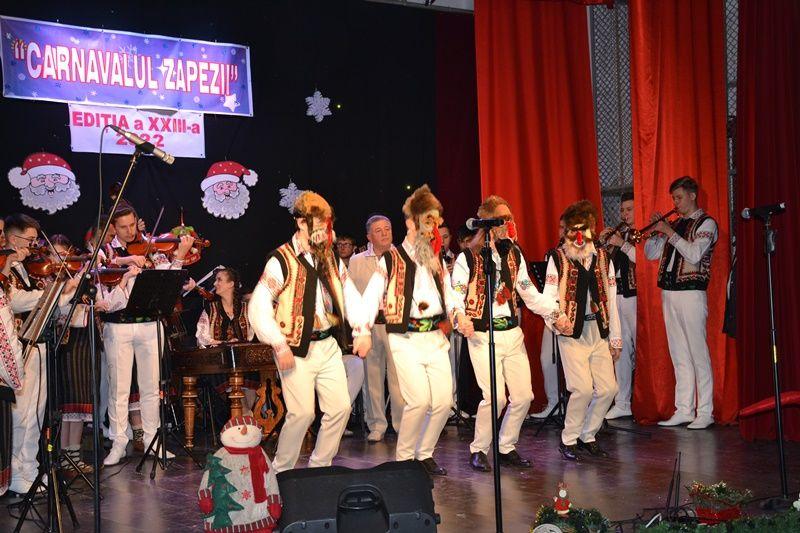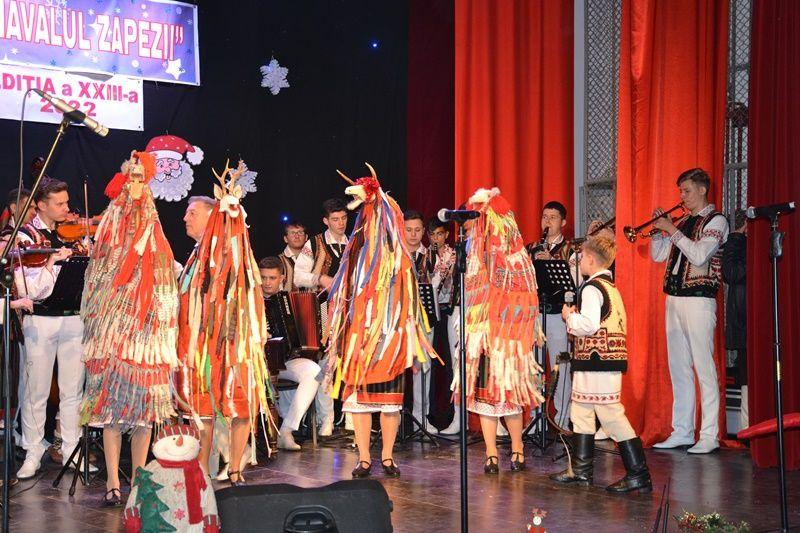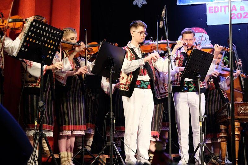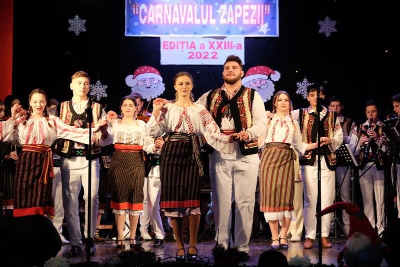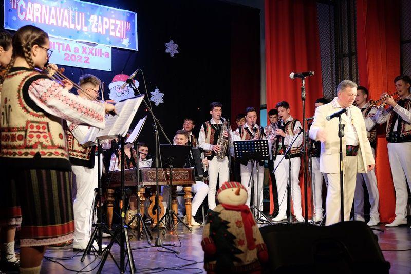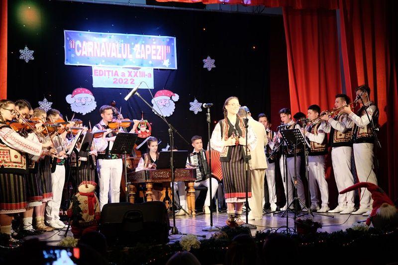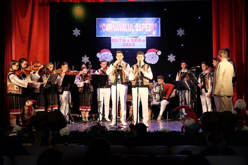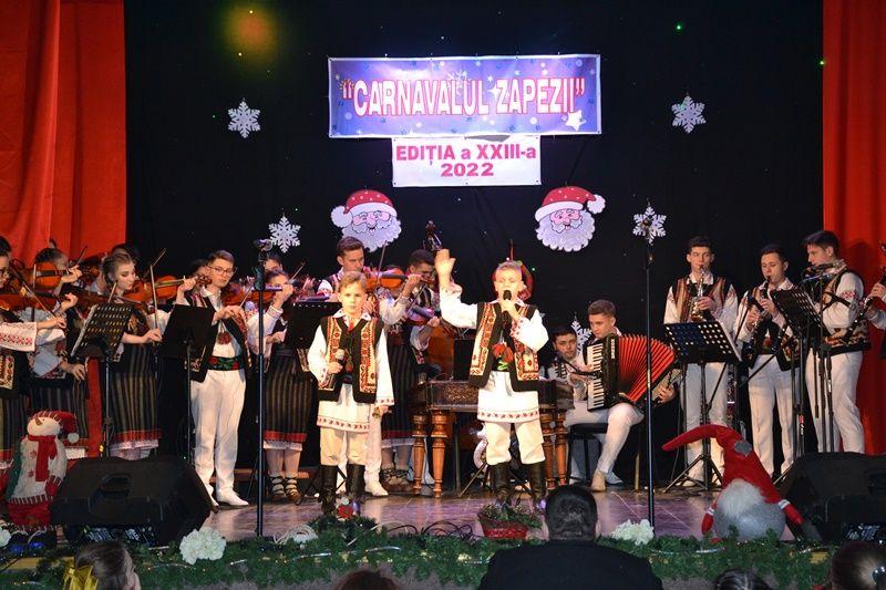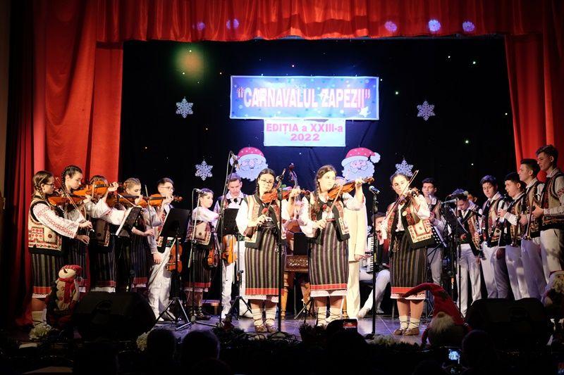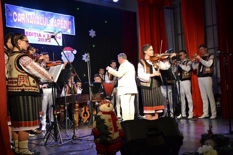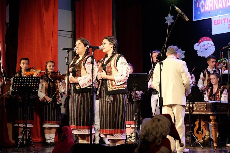 Locurile pe scenă au fost ocupate, apoi, de Orchestra mare „Mugurelul”, grupul care ne reprezintă municipiul în spectacole și festivaluri naționale și internaționale. Repertoriul prezentat la „Carnavalul Zăpezii” a fost unul bogat, cu melodii populare din diferite zone foclorice ale țării, interpretate de orchestră, soliști vocali și soliști instrumentiști.