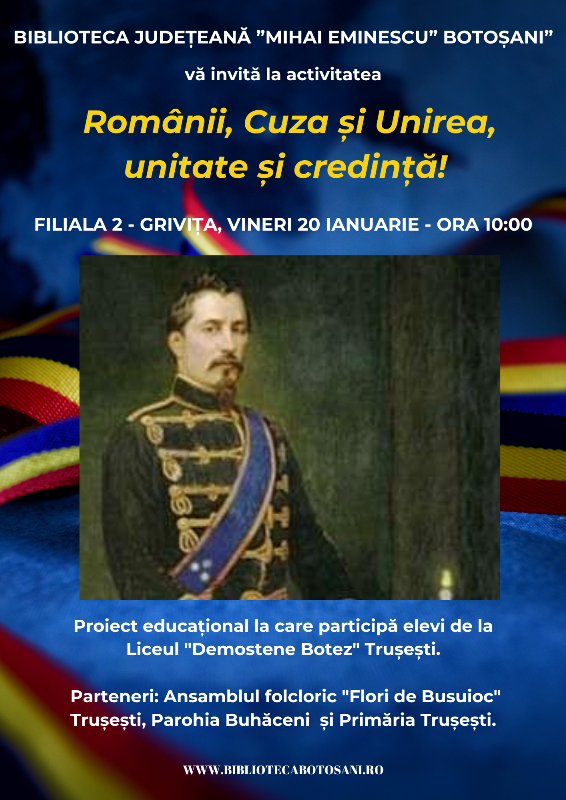 Cu prilejul zilei de 24 ianuarie – Mica Unire, elevi de la Liceul "Demostene Botez" Trușești în parteneriat cu Ansamblul folcloric „Flori de Busuioc” Trușești, Parohia Buhăceni și Primăria Trușești vor derula la Biblioteca Județeană „Mihai Eminescu” Botoșani proiectul educațional "Românii, Cuza și Unirea, unitate și credință!". Manifestarea va fi găzduită vineri, 20 ianuarie, începând cu ora 10:00 de Filiala nr. 2 – Grivița a bibliotecii.