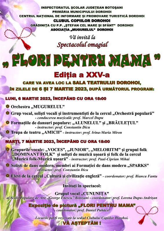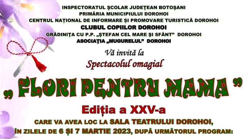 Sala Teatrului Dorohoi va găzdui în perioada 6-7 martie 2023 Concertul omagial „Flori pentru mama”, ediţia a XXV-a, organizat de Clubul Copiilor Dorohoi, cu sprijinul Inspectoratului Şcolar Judeţean Botoşani şi al Primăriei municipiului Dorohoi, în parteneriat cu Asociaţia „Mugurelul” Dorohoi, Centrul Național de Informare Turistică Dorohoi și Grădinița cu P.P. „Ștefan cel Mare și Sfânt” Dorohoi.