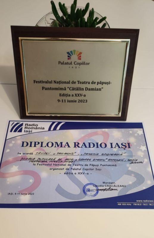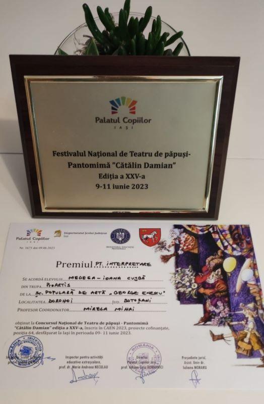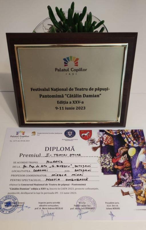 Trupa de teatru ProARTIS de la Școala Populară de Arte „George Enescu” din Botoșani, secția de Actorie din Dorohoi, a participat sâmbătă, 10 iunie 2023, la Festivalul Național de Teatru de păpuși – Pantomimă „Cătălin Damian”, ediția a XXV-a, organizat de Palatul Copiilor Iași, sub egida Ministerului Educației.