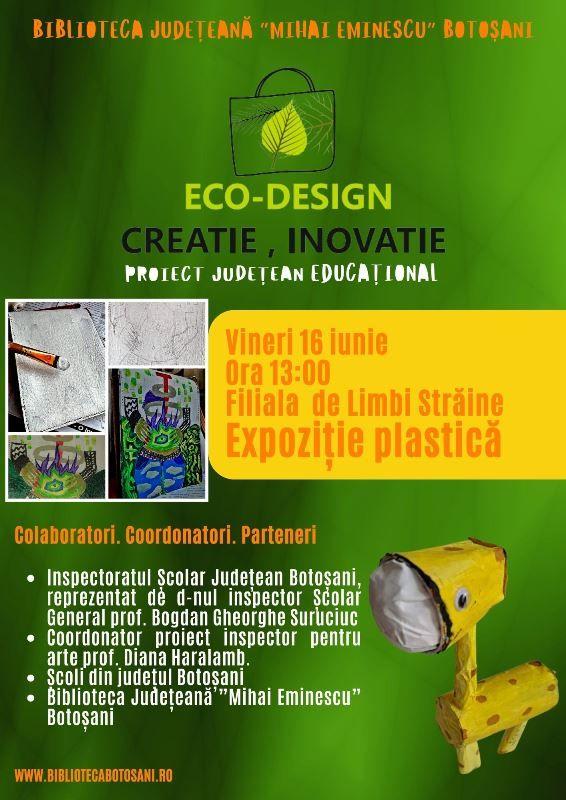 Biblioteca județeană "Mihai Eminescu" Botoşani, Filiala de Limbi Străine, participă în calitate de partener, la Proiectul Județean Educațional ”Eco-Design, Creație, Inovație”. Susținători și parteneri ai evenimentului sunt Inspectoratul Școlar Județean Botoșani, reprezentat de d-nul Inspector Școlar General prof. Bogdan Gheorghe Suruciuc, d-na Inspector pentru arte prof. Diana Haralamb și mai multe școli partenere din Județul Botoșani.