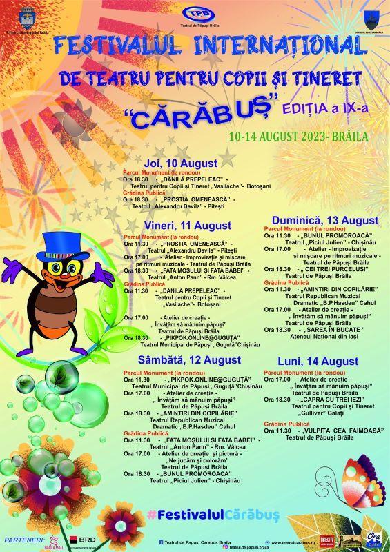 Teatrul pentru Copii și Tineret „Vasilache” Botoșani este invitat să participe la Festivalul Internaţional de Teatru pentru Copii şi Tineret „Cărăbuş”, ediţia a IX-a, festival organizat de Teatrul de Păpuşi „Cărăbuş” din Brăila, în perioada 10-14 august 2023.