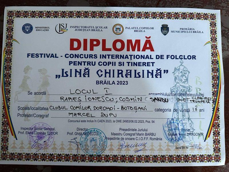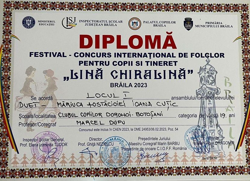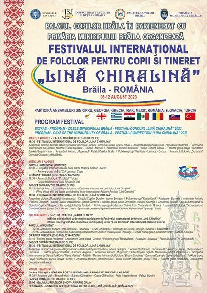 În perioada 8-12 august, 2023, s-a desfășurat la Brăila, Festivalul - Concurs Internațional de Folclor pentru Copii și Tineret „Lină Chiralină”, ediția a XXII-a, organizat de Palatul Copiilor Brăila și Primăria Municipiului Brăila.
