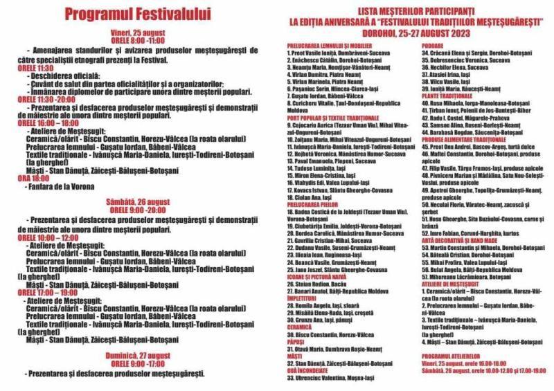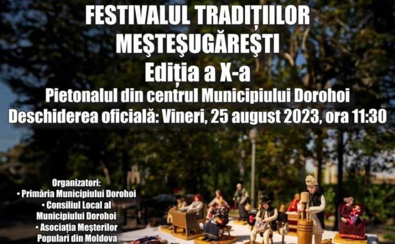 Primăria Municipiului Dorohoi, Consiliul Local al Municipiului Dorohoi și Asociaţia Meşterilor Populari din Moldova, având partener Centrul Național de Informare și Promovare Turistică Dorohoi (CNIPT), organizează în perioada 25-27 august 2023 pe Pietonalul din centrul Municipiului Dorohoi cea de-a X-a ediție, aniversară, a Festivalului Tradițiilor Meșteșugărești.