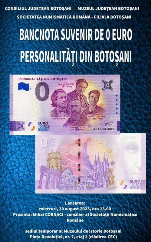 Muzeul Județean Botoșani organizează miercuri, 30 august 2023, ora 13.00, lansarea bancnotei suvenir de 0 euro „Personalități din Botoșani”. Bancnota a fost tipărită cu aprobarea Băncii Naționale a Franței și este securizată la standardele impuse de Banca Centrală Europeană, similare bancnotelor reale.