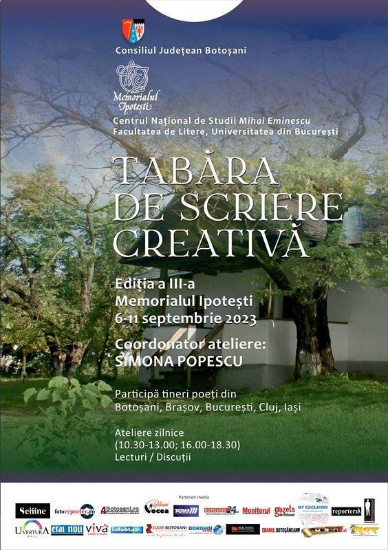 În perioada 6-11 septembrie 2023, la Memorialul Ipotești – Centrul Național de Studii „Mihai Eminescu”, instituție în subordinea Consiliului Județean Botoșani, va avea loc Tabăra de scriere creativă.