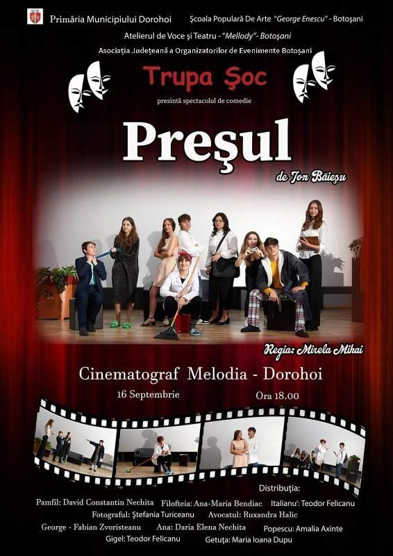 Cinematograful Melodia din Dorohoi va găzdui sâmbătă, 16 septembrie, începând cu ora 18:00 spectacolul de comedie Preșul, susținut de trupa Șoc. Intrarea este liberă.