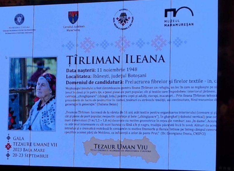 Gala „Tezaure Umane Vii” s-a desfășurat la Teatrul Municipal Baia Mare unde au fost premiați de pe întreg teritoriul țării cei 12 păstrători și transmițători ai patrimoniului cultural. Până în prezent doi botoșăneni au primit titlul de „Tezaur Uman Viu”: Țîrliman Ileana și Ciubotărița Constantin.