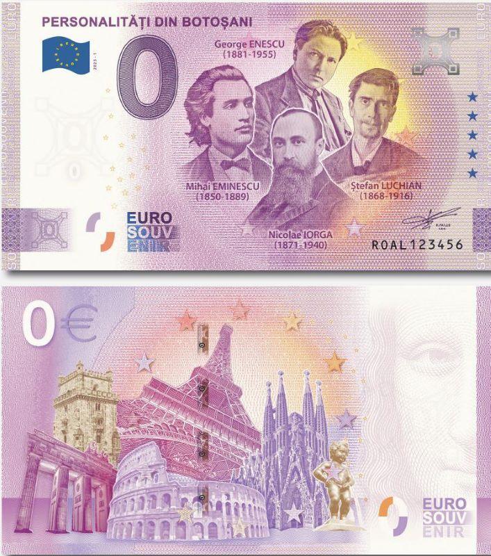 Muzeul Județean Botoșani anunță cu încântare succesul cultural și comercial notabil al bancnotei suvenir de 0 euro „Personalități din Botoșani”, lansată oficial la finalul lunii august 2023, în cadrul unei serii tipărite cu aprobarea Băncii Naționale a Franței, securizată la standardele impuse de Banca Central Europeană și similară structural bancnotelor reale. Asumându-și obiectivele generale ale proiectului bancnotelor de 0 euro, care urmărește promovarea brandurilor de interes național, a valorilor, figurilor și obiectivelor emblematice pentru cultura statelor membre ale Uniunii Europene, bancnota care omagiază patru dintre personalitățile definitorii pentru spațiul botoșănean și pentru istoria națională a fost emisă într-un tiraj de 11.000 de exemplare.