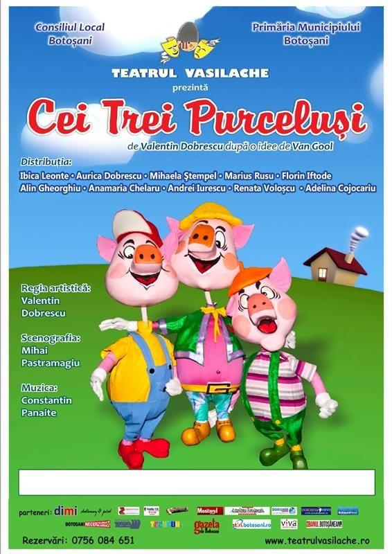 Spectacolul „Cei trei purceluşi”, este un spectacol după o poveste îndrăgită de copii şi transpusă în scenă de regizorul Valentin Dobrescu, după o idee de Van Gool. Text şi regie artistică: Valentin Dobrescu, scenografia este semnată de Mihai Pastramagiu, muzica compusă de Constantin Panaite.