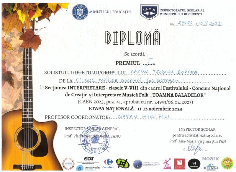- Carina-Teodora Borcea, ce a concurat la secțiunea Interpretare, clasele V-VIII (Palate și Cluburi ale copiilor și Școli de artă), a obținut premiul I;
