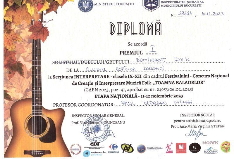 - Grupul „Dominant folk” (format din Bianca-Cornelia Apostol, Carina-Teodora Borcea, Ștefania Horopciuc și Eliza-Andreea Stan), ce a concurat la secțiunea Interpretare grupuri, clasele IX-VIII (Palate și Cluburi ale copiilor și Școli de artă), a obținut premiul I.