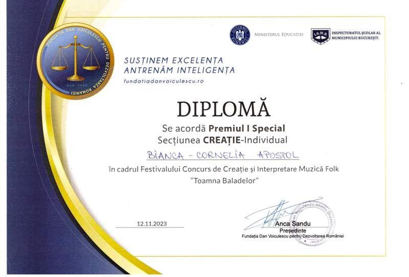 - Bianca-Cornelia Apostol a concurat atât la secțiunea Interpretare, clasele IX-XII (Palate și Cluburi ale copiilor și Școli de artă), obținând premiul al II-lea, cât și la secțiunea Creație, clasele IX-XII (Palate și Cluburi ale copiilor și Școli de artă), obținând premiul I și Premiul Special al Fundației Dan Voiculescu pentru Dezvoltarea României.