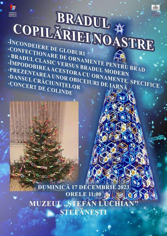 Cu prilejul marii sărbătorii creștine a Crăciunului, constituind totodată o celebrare a familiei, în care oamenii își deschid sufletele, se bucură și își fac daruri, Muzeul Județean Botoșani, prin Secția de Artă Plastică – Etnografie, desfășoară la Muzeul „Ștefan Luchian” Ștefănești, duminică, 17 decembrie 2023, de la orele 11.00, o serie de activități sub titlul „Bradul copilăriei noastre”, care vor include: