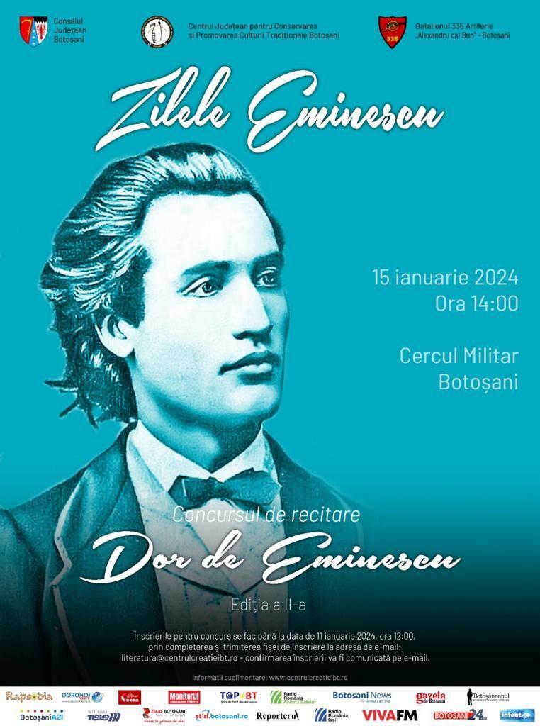 Centrul Județean pentru Conservarea și Promovarea Culturii Tradiționale Botoșani, cu sprijinul Consiliului Județean Botoșani, și în parteneriat cu Batalionul 335 Artilerie „Alexandru cel Bun” Botoșani, organizează în data de 15 ianuarie 2024, ora 14:00, la Cercul Militar Botoșani, a doua ediție a Concursului de recitare „DOR DE EMINESCU”, în cadrul Zilelor Eminescu 2024.