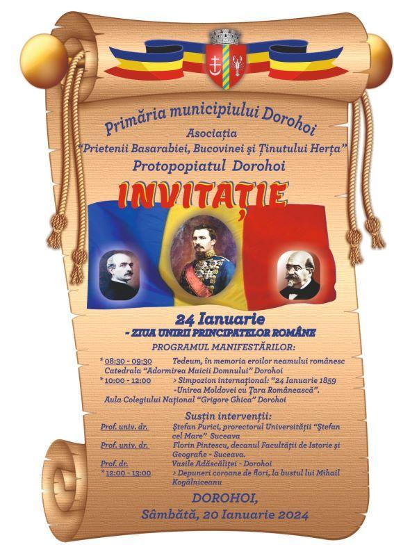 Primăria Municipiului Dorohoi, în colaborare cu Asociația „Prietenii Basarabiei, Bucovinei și Ținutului Herța” și cu Protopopiatul Dorohoi, a lansat o invitație privind activitățile care se vor organiza în data de 24 ianuarie, Ziua Principatelor Române.