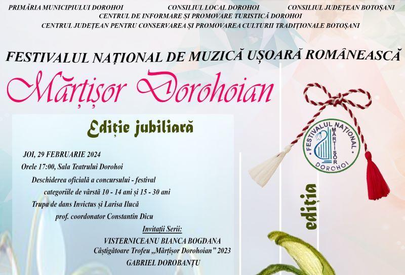 Așadar, în perioada 29 februarie – 01 martie 2024, vă așteptăm la ediția cu numărul 40 a Festivalului Național de Muzică Ușoară Românească „Mărțișor Dorohoian’’.