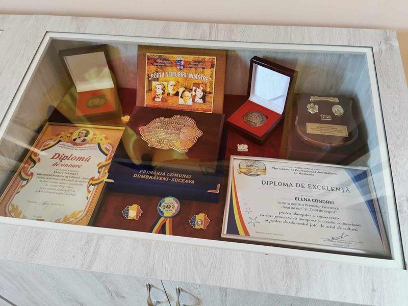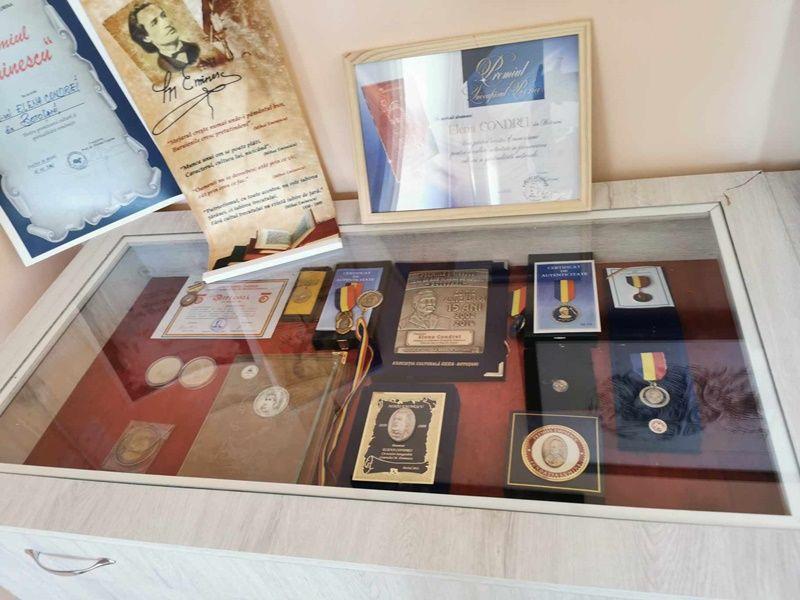 Secțiunea de medalii, plachete, insigne ilustrează activitatea de eminescolog și colecționar al Elenei Condrei, precum și activitatea de scriitor, în vitrine fiind expuse și titlurile apărute în decursul anilor.