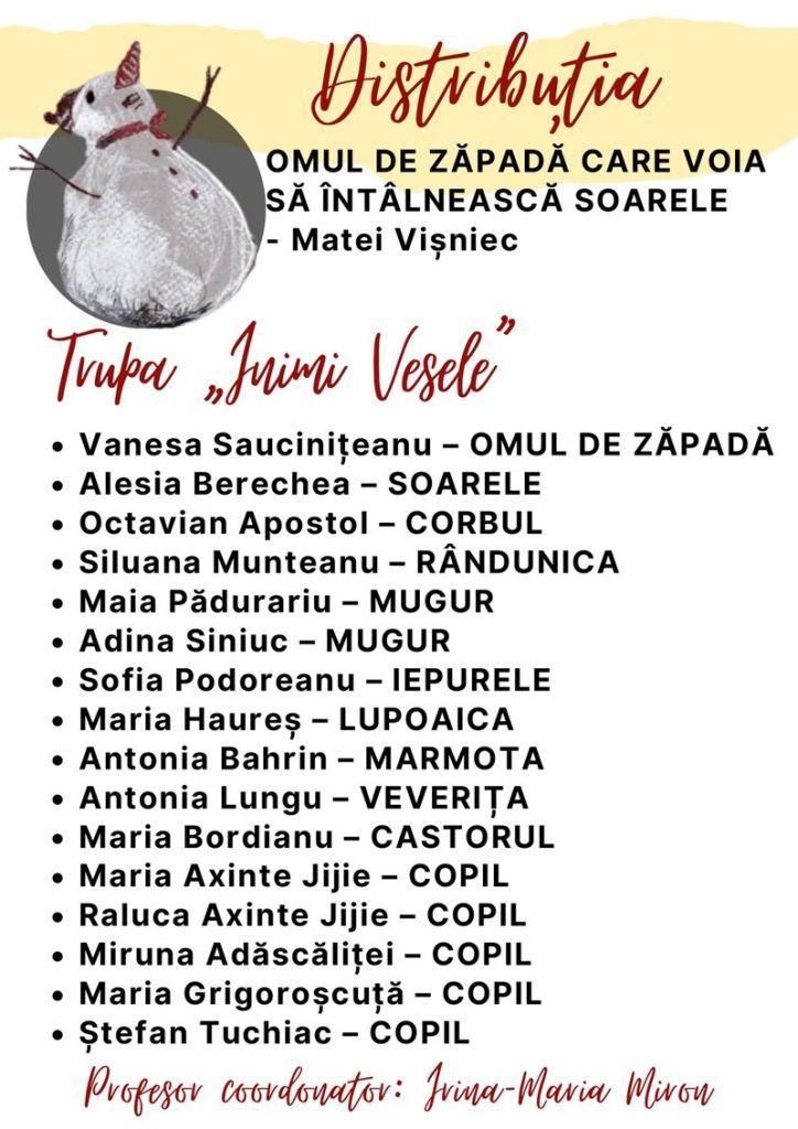Seara a început cu spectacolul „Omul de Zăpadă care voia să întâlnească Soarele” conceput după piesa de teatru scrisă de Matei Vișniec. Povestea emoționantă a Omului de Zăpadă care nu știa că urmează să se topească odată cu sosirea primăverii, a fost prezentată de Trupa „Inimi Vesele”, elevi de clasele III-V de la cercul Educație Civică – secțiunea Teatru.
