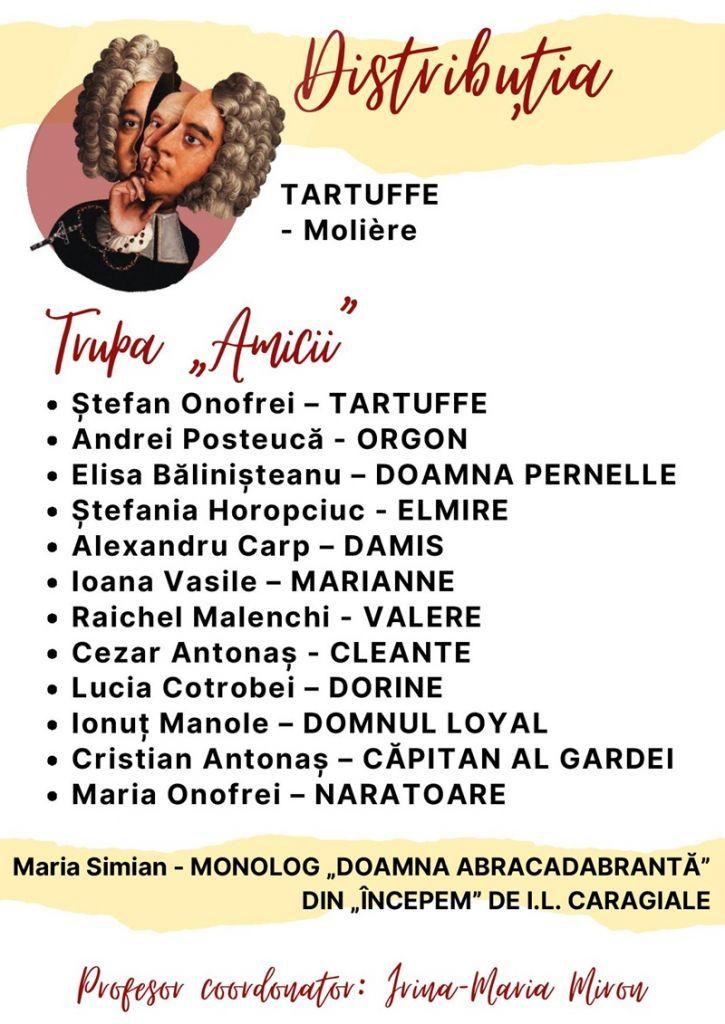 Scena a fost dominată, apoi, de Trupa „Amicii”, grupa de performanță a cercului, care a evoluat cu spectacolul „Tartuffe”, după comedia lui Jean-Baptiste Poquelin, cunoscut mai bine ca Molière. În costume de epocă, artiștii au prezentat publicului înlănțuirea de evenimente și intrigi create de impostorul Tartuffe în familia lui Orgon, un nobil al acelei perioade.