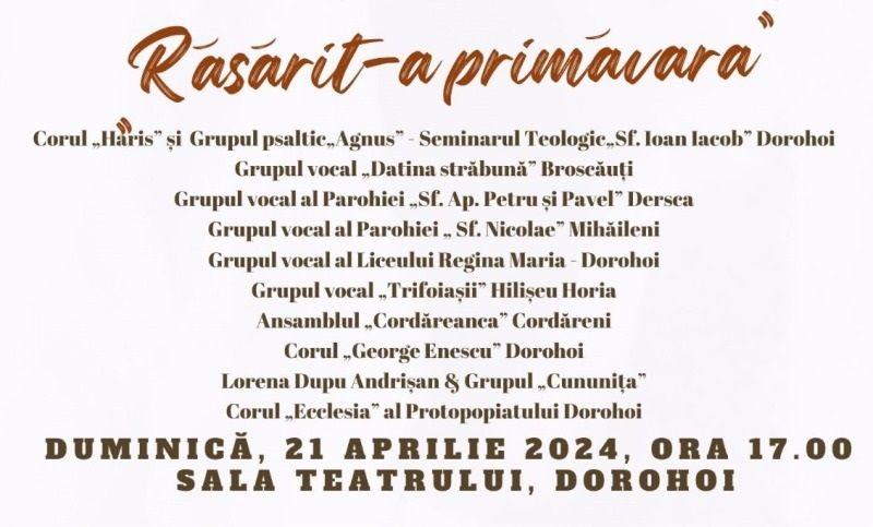 Concertul de pricesne și cântări bisericești „Răsărit-a primăvara” se va bucura de prezența mai multor tineri soliști talentați din zona Protopopiatului nostru și de următoarele coruri și grupuri vocale: Corul Haris și Grupul psaltic „Agnus” ale Seminarului Teologic „Sfântul Ioan Iacob” Dorohoi, Grupul vocal „Datina străbună” (Broscăuți), Grupul vocal al Parohiei „Sf. Apostoli Petru și Pavel” (Dersca), Grupul vocal al Parohiei „Sfântul Nicolae” (Mihăileni), Grupul vocal al Liceului Regina Maria – Dorohoi, Grupul vocal Trifoiașii (Hilișeu Horia), Ansamblul Cordareanca (Cordăreni), Corul „George Enescu”, Lorena Dupu Andrișan & Grupul Cununița și Corul Ecclesia – Protopopiatul Dorohoi.