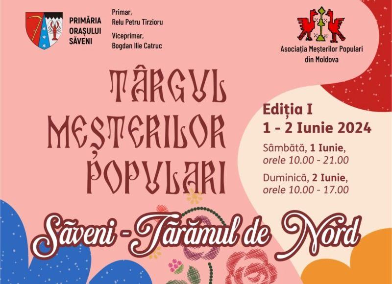 Asociaţia Meşterilor Populari din Moldova și Primăria Orașului Săveni din județul Botoșani, în parteneriat cu Societatea Cultural Artistică „Arlechin”, organizează la Săveni, în Parcul Tineretului, în perioada 1-2 iunie 2024, prima ediţie a Târgului Meșterilor Populari „Săveni – Tărâmul de Nord”.