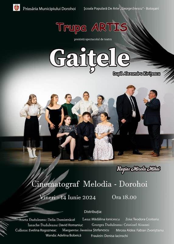 Trupa ARTIS a Școlii Populare de Arte „George Enescu” Botoșani, secția Actorie-Dorohoi, în colaborare cu Primăria Municipiului Dorohoi prezintă vineri, 14 iunie 2024, ora 18.00, la Cinema Melodia din Dorohoi, spectacolul de teatru „GAIȚELE”, după Alexandru Kirițescu.