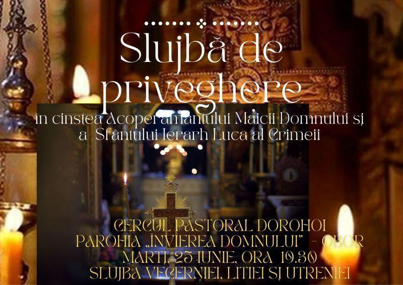 Marți, 25 iunie, ora 19.00, Slujba de Priveghere în cinstea Acoperământului Maicii Domnului și a Sf. Ier. Luca al Crimeii, la Biserica „Învierea Domnului” – OBOR.