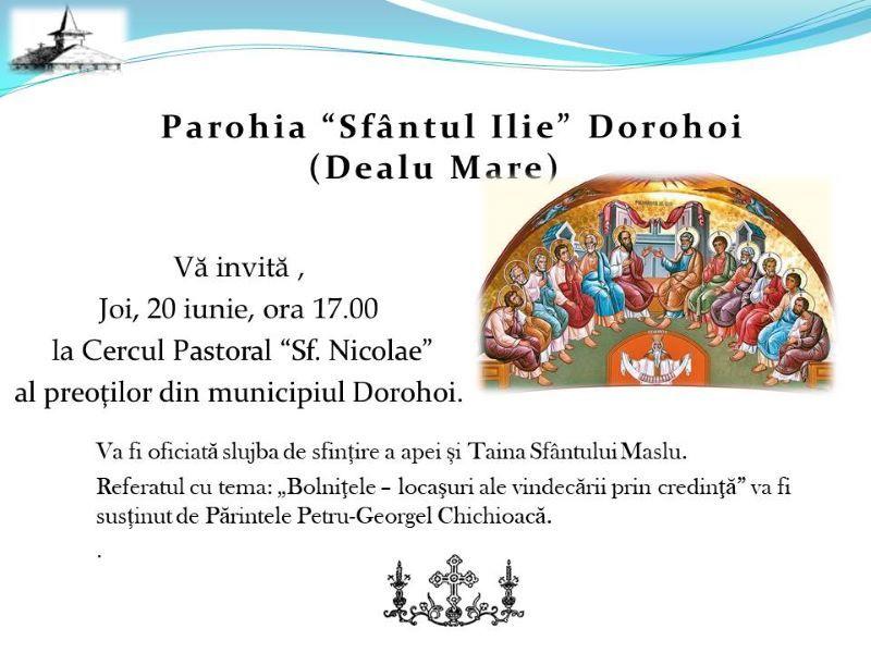 Joi, 20 aprilie joi, ora 17.00, Parohia Sfântul Ilie – Dealu Mare, va găzdui întâlnirea Cercului pastoral-misionar nr. 1 – „Sfântul Nicolae”, în cadrul căreia părintele Petru-Georgel Chichioacă va susţine referatul cu tema: „Bolniţele – locaşuri ale vindecării prin credinţă”.