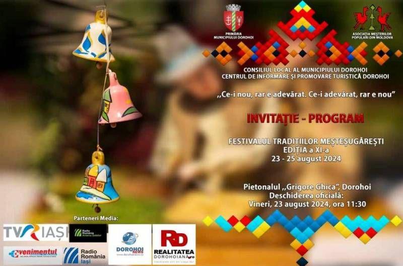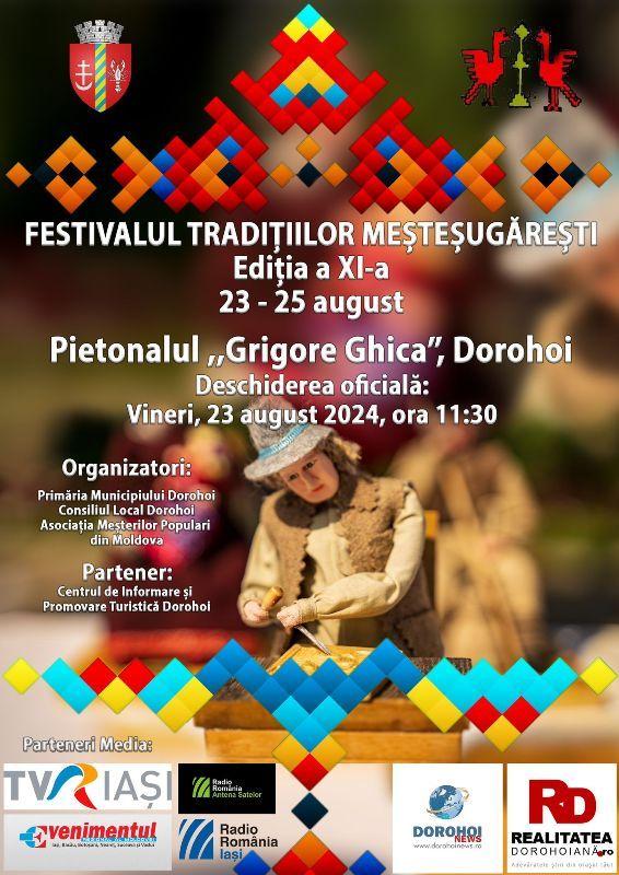 Primăria Municipiului Dorohoi, Consiliul Local al Municipiului Dorohoi, Asociaţia Meşterilor Populari din Moldova și Centrul Național de Informare și Promovare Turistică Dorohoi (CNIPT) organizează în perioada 23-25 august 2024 pe Pietonalul „Grigore Ghica” din centrul Municipiului Dorohoi cea de-a XI-a ediție a Festivalului Tradițiilor Meșteșugărești.