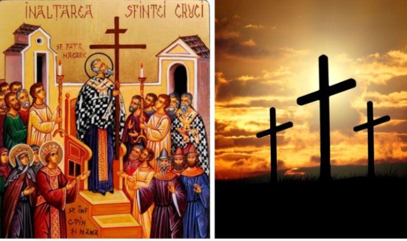 Descoperirea Sfintei Cruci de către Sfânta Împărăteasă Elena, mama împăratului Constantin cel Mare, în anul 326, la Ierusalim. După ce a descoperit Crucea pe care a fost răstignit Iisus, Elena a înălțat-o pentru prima dată în fața poporului. Episcopul Macarie al Ierusalimului a prezentat-o solemn, ridicând-o deasupra capului pentru ca toți credincioșii să o poată vedea.