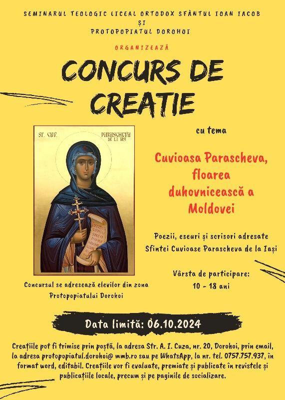 Protopopiatul Dorohoi și Seminarul Teologic „Sfântul Ioan Iacob” Dorohoi, organizează în perioada 23 septembrie -15 octombrie, Concursul de creație, cu tema „Sfânta Parascheva – floarea duhovnicească a Moldovei”.