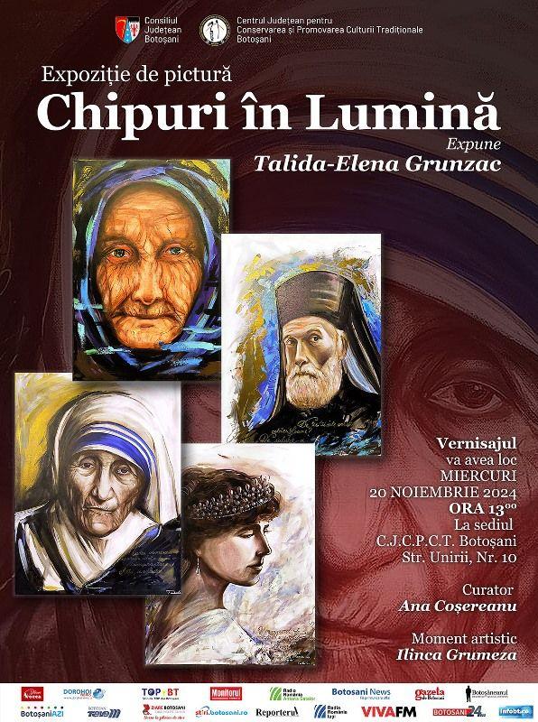 Centrul Județean pentru Conservarea și Promovarea Culturii Tradiționale Botoșani, instituție publică de cultură aflată în subordinea Consiliul Județean Botoșani, vă invită miercuri, 20 noiembrie 2024, ora 13:00, la vernisajul expoziției de pictură „Chipuri în Lumină”, realizată de artista Talida–Elena Grunzac, profesor de Arte plastice la Colegiul Național „A.T. Laurian” din Botoșani.