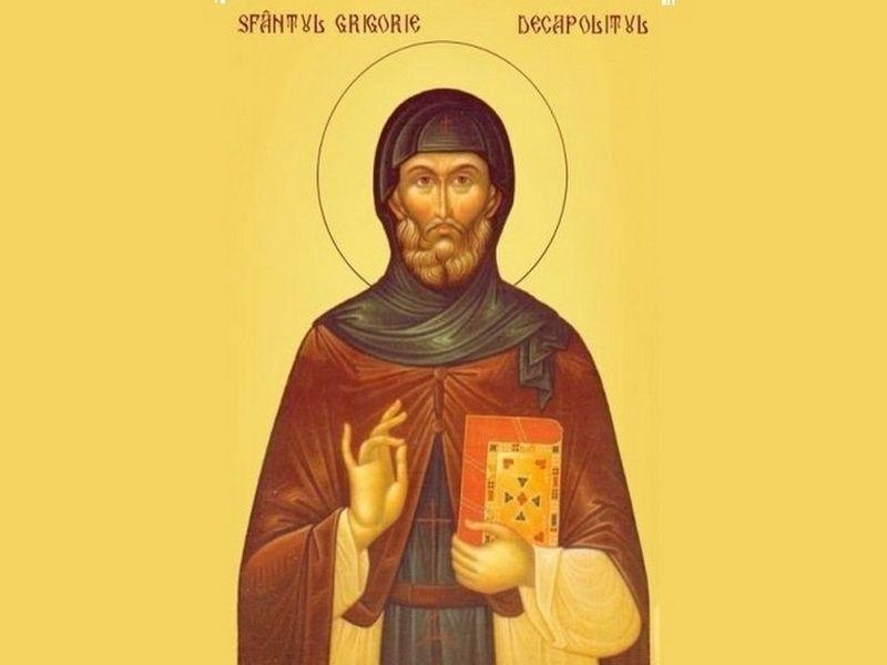 Sfântul Grigorie Decapolitul (†842) s-a născut şi a crescut în sud-estul Asiei Mici, în Irinopole, una din cele 10 cetăţi din Decapole, din părinţi dreptcredincioşi, Serghie şi Maria, pe vremea luptătorilor împotriva sfintelor icoane, sub domnia lui Leon Armeanul (813-820). Din fragedă vârstă a fost dat să înveţe carte şi pentru că avea aplecare spre cele dumnezeieşti, Grigorie citea pe la biserici din Sfintele Scripturi.