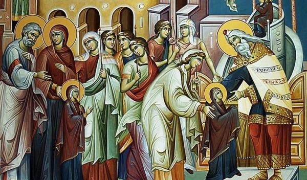 Praznicul Intrării în biserică a Maicii Domnului semnifică aducerea Fecioarei Maria la templul din Ierusalim, la vârsta de 3 ani, de către părinţii săi, Ioachim şi Ana. Sfânta Ana nu putea să nască prunci şi de aceea, luând îndemn din Cartea Sfântă, din cele ce s-au petrecut cu cealaltă Ana (care fusese şi ea stearpă, mama prorocului Samuel), se ruga fierbinte lui Dumnezeu, împreună cu bărbatul ei Ioachim, să le dăruiască un copil. Şi au făgăduit Sfinţii Ioachim şi Ana că dacă le va fi îndeplinită cererea, vor închina pruncul Domnului. Şi aşa a născut-o Sfânta Ana pe Fecioara Maria, Născătoarea de Dumnezeu.