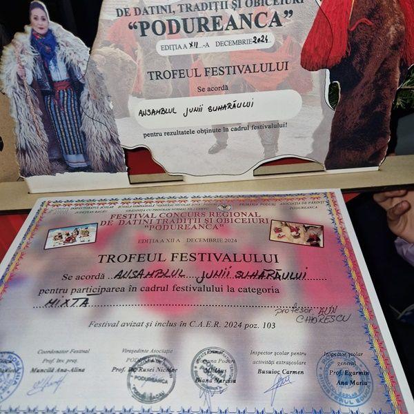 • Trofeul Festivalului – o performanță deosebită, care subliniază calitatea și autenticitatea repertoriului prezentat de ansamblul suharăuan.