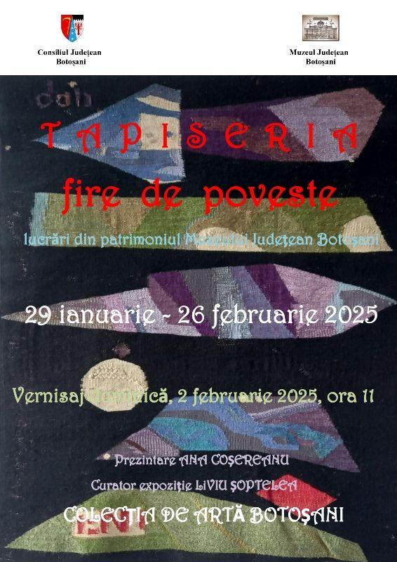 Muzeul Județean Botoșani, Secția de Artă Plastică, Etnografie și Științele Naturii, organizează în perioada 29 ianuarie – 26 februarie 2025, în spațiul Colecției de Artă, expoziția tematică „Tapiseria – fire de povesteˮ.