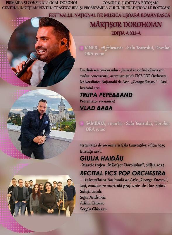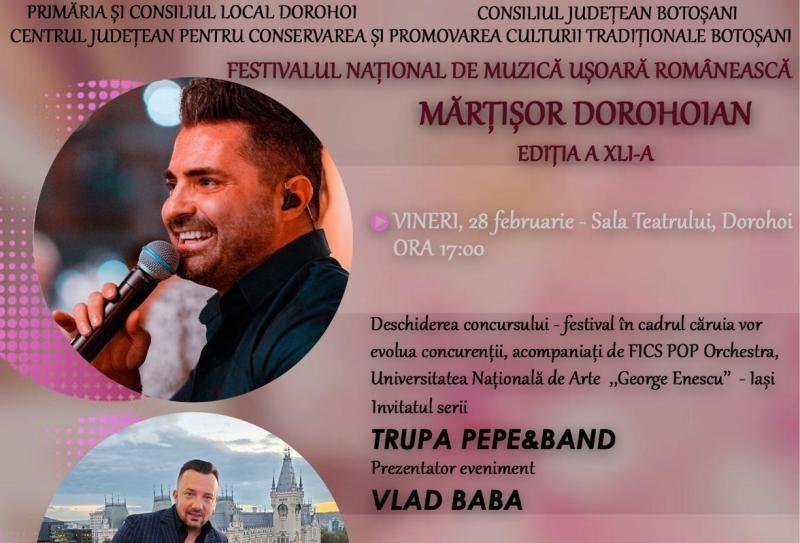 Centrul Județean pentru Conservarea și Promovarea Culturii Tradiționale Botoșani în parteneriat cu Primăria Dorohoi și Centrul de Informare Turistică Dorohoi organizează cea de-a XLI a ediție a Festivalului Național de Muzică Ușoară Românească „Mărțișor dorohoian”.