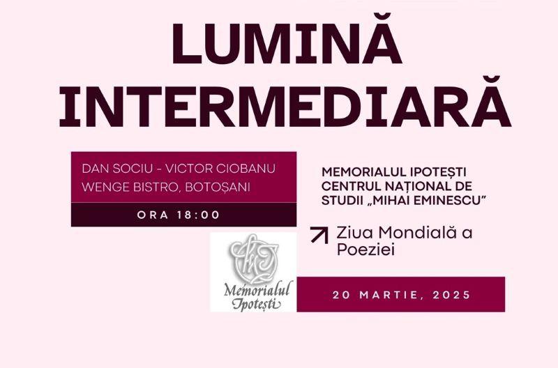 Recitalul de poezie contemporană și muzică orientală Lumină intermediară – Dan Sociu și Victor Nicolae Ciobanuva avea loc pe 20 martie, la ora 18.00, la Wenge Bistro din Botoșani. Spectacolul va fi urmat de lecturi de poezie susținute de poeții invitați și discuți cu autorii.