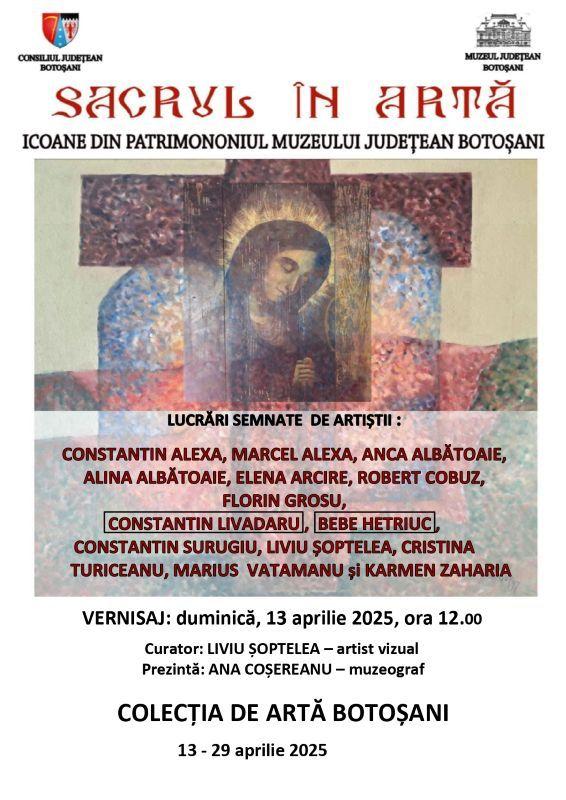Muzeul Județean Botoșani, Secția de Artă Plastică, Etnografie și Științele Naturii, organizează, în spațiul Colecției de Artă, expoziția intitulată „Sacrul în artă”, dedicată sărbătorilor pascale.