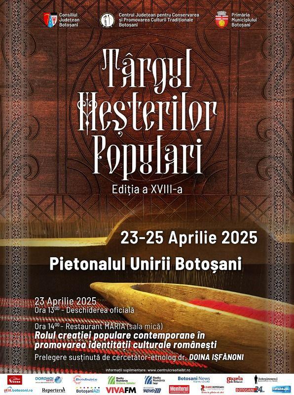 Miercuri, 23 aprilie 2025, în ziua de Sfântul Gheorghe, începând cu ora 13:00, pe Pietonalul Unirii din Botoșani, va avea loc deschiderea oficială a activității Târgul Meșterilor Populari, ediția a XVIII-a, activitate organizată de Centrul Județean pentru Conservarea și Promovarea Culturii Tradiționale Botoșani, instituție publică de cultură, aflată în subordinea Consiliului Județean Botoșani, cu sprijinul Primăriei Municipiului Botoșani.