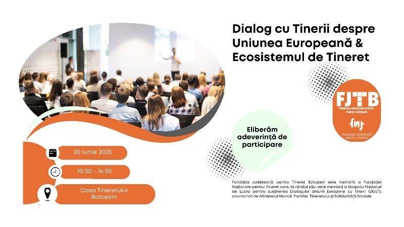 Botoșani, 20 iunie 2025 – Fundația Județeană pentru Tineret Botoșani, în parteneriat cu Fundația Națională pentru Tineret, organizează evenimentul „Dialog cu Tinerii despre Uniunea Europeană și Ecosistemul de Tineret”, care va avea loc joi, 20 iunie, între orele 10:30 – 14:30, la Casa Tineretului din Botoșani.