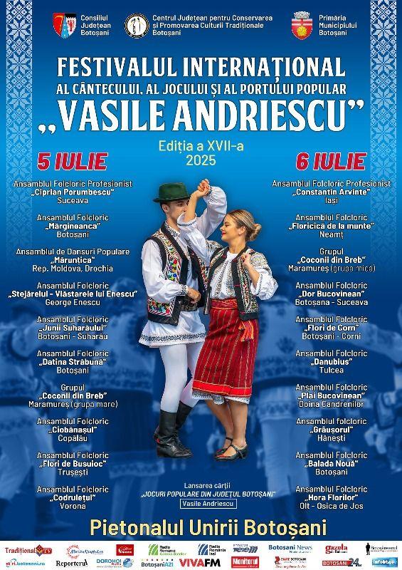 Centrul Județean pentru Conservarea și Promovarea Culturii Tradiționale Botoșani, cu sprijinul Consiliului Județean Botoșani, organizează în perioada 5-6 iulie 2025, pe Pietonalul Unirii din Municipiul Botoșani, cea de-a XVII-a ediție a Festivalului Internațional al Cântecului, al Jocului și al Portului Popular „Vasile Andriescu”, un festival de renume care cinstește memoria celui mai cunoscut și reprezentativ coregraf al județului Botoșani. Vasile Andriescu a fost o personalitate culturală cu o activitate de peste 30 de ani la Centrul Județean pentru Conservarea și Promovarea Culturii Tradiționale Botoșani. Cetățean de onoare al comunei Dimăcheni, a lăsat în urmă culegerea „Jocuri populare din județul Botoșani”, apărută în anul 1980, un reper extrem de valoros pentru cei interesați de jocul tradițional.