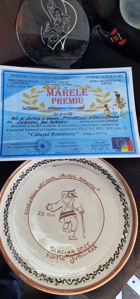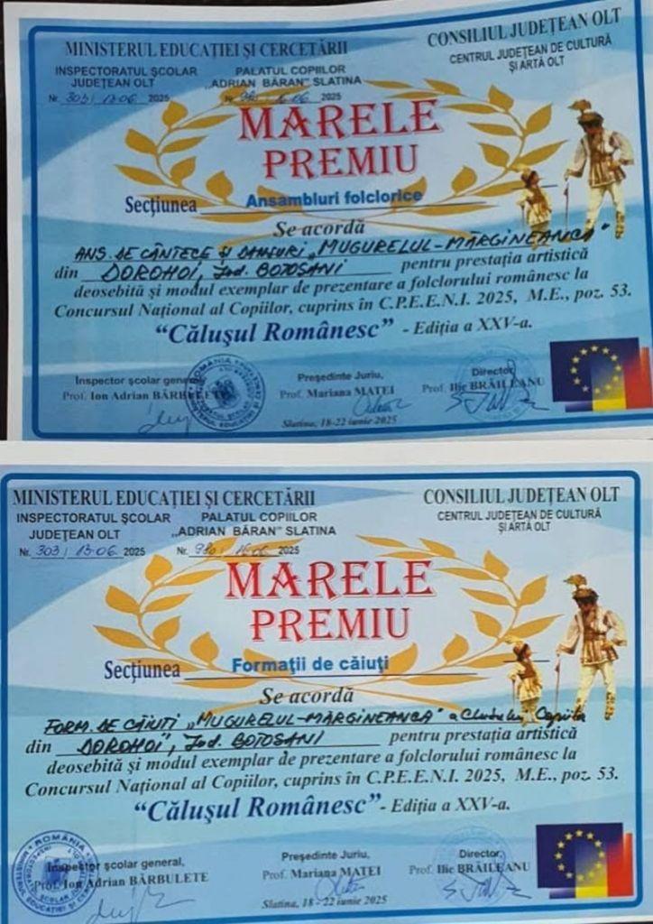 Ansamblul de Cântece și Dansuri „Mugurelul-Mărgineanca”, format din Orchestra „Mugurelul” a Clubului Copiilor Dorohoi și dansatorii Ansamblului „Mărgineanca” al Casei de Cultură a Sindicatelor „Nicolae Iorga” Botoșani, s-a întors acasă cu două MARI PREMII obținute la prestigiosul Concurs Național al Copiilor „Călușul Românesc”, ediția a XXV-a, desfășurat la Slatina. Marele Premiu – Secțiunea Ansambluri Folclorice și Marele Premiu – Secțiunea Formații de Căluți.