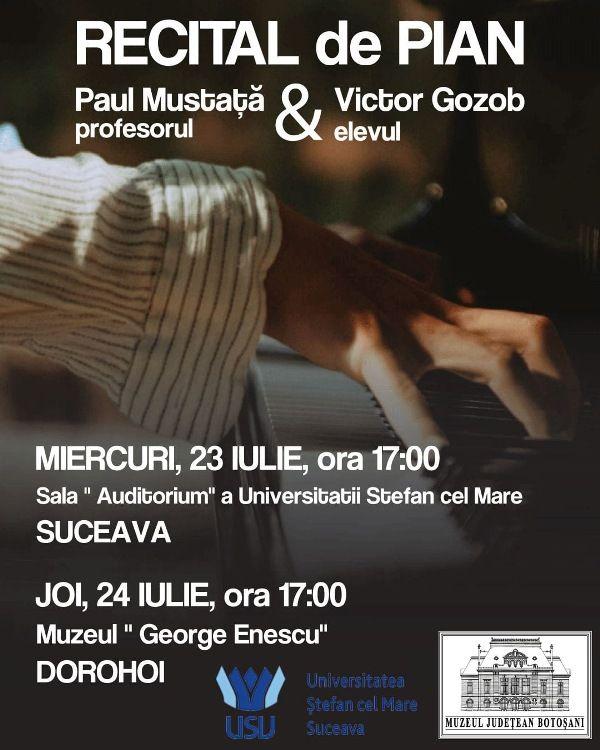 Amatorii de muzică bună suntașteptați la Muzeul Memorial „George Enescu” din Dorohoi pentru un recital special, în cadrul căruia profesorul și studentul vor performa împreună. Paul Mustață și elevul său, Victor Gozob, vă invită la concert joi, 24 iulie, de la ora 17.00.