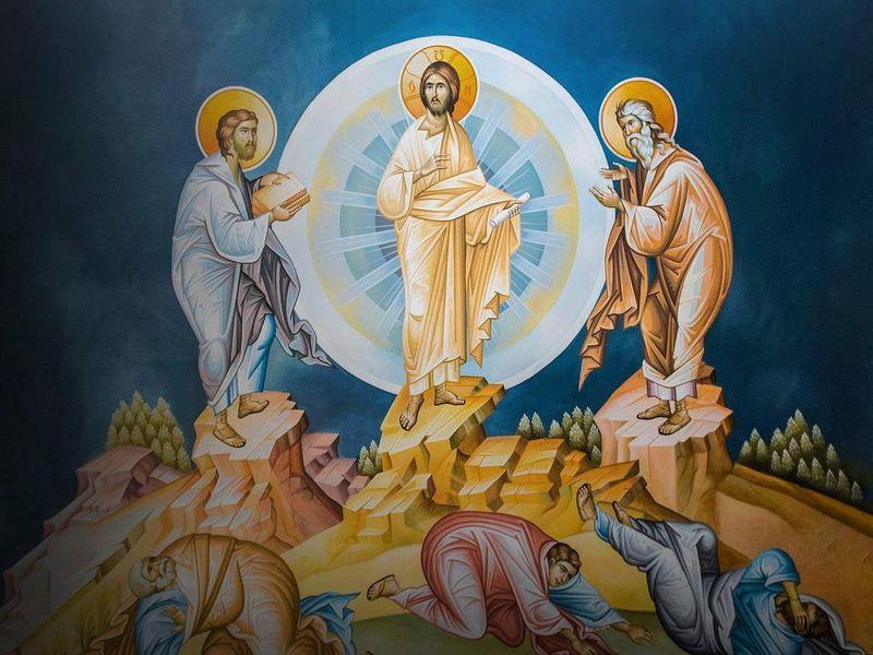 Urcându-Se pe munte, Hristos-Domnul S-a depărtat puţin de ucenici şi, suindu-Se pe un loc mai înalt, Se ruga, iar cei trei ucenici, osteniți de lungimea drumului și a rugăciunii, se luptau cu somnul. Dar, când s-au deşteptat bine, Mântuitorul S-a schimbat la față înaintea lor, strălucind cu slava dumnezeirii Sale. Iar înaintea Lui au stat prorocii Moise și Ilie, vorbind față către față cu El, împlinindu-se astfel dorința celor doi profeţi ai Vechiului Testament de a-L vedea pe Dumnezeu. Și văzând fața Sa luminoasă ca soarele și hainele Lui albe ca zăpada, Petru a vrut să ridice pentru cei trei câte o colibă.