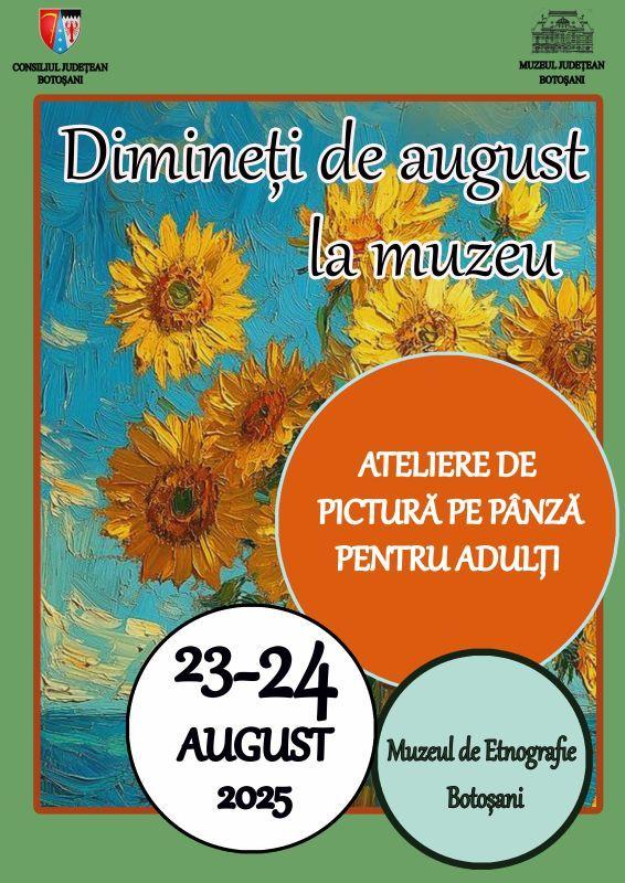 Muzeul Județean Botoșani vă invită, în perioada 23-24 august 2025, în intervalul orar 10.00 – 13.00, la ateliere de pictură pe pânză dedicate adulților pasionați de artă și de frumos. Acestea sunt concepute atât pentru începători, cât și pentru cei care au deja experiență artistică.
