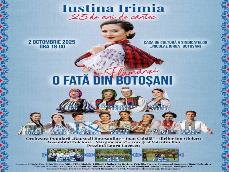 Deși face parte din tânăra generație de interpreți ai muzicii populare, Iustina Irimia, o fată din Flămânzii Botoșanilor, sărbătorește anul acesta 25 de ani de carieră, într-un spectacol de folclor organizat în data de 2 octombrie 2025, începând cu ora 18:00, la Casa de Cultură a Sindicatelor „Nicolae Iorga” Botoșani.