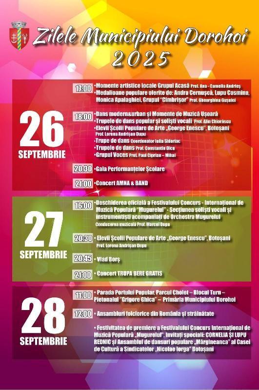 Timp de trei zile, începând cu 26 septembrie 2025, Municipiul Dorohoi devine o scenă vibantă, cu evenimente găzduite în Piațeta „Grigore Ghica’’, Dorohoi.