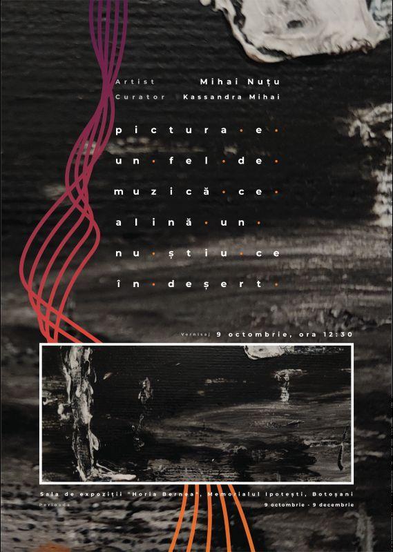 Memorialul Ipoteşti – Centrul Naţional de Studii „Mihai Eminescuˮ, instituţie aflată în subordinea Consiliului Judeţean Botoşani, găzduieşte în perioada 9 octombrie – 9 decembrie 2025, în sala de expoziţii temporare „Horia Berneaˮ, expoziţia personală a artistului Mihai Nuţu, Pictura este un fel de muzică ce alină un nu-ştiu-ce, în deşert, curatoriată de Kassandra Mihai. Vernisajul va avea loc pe 9 octombrie 2025, ora 12:30, în prezenţa artistului şi a curatoarei.